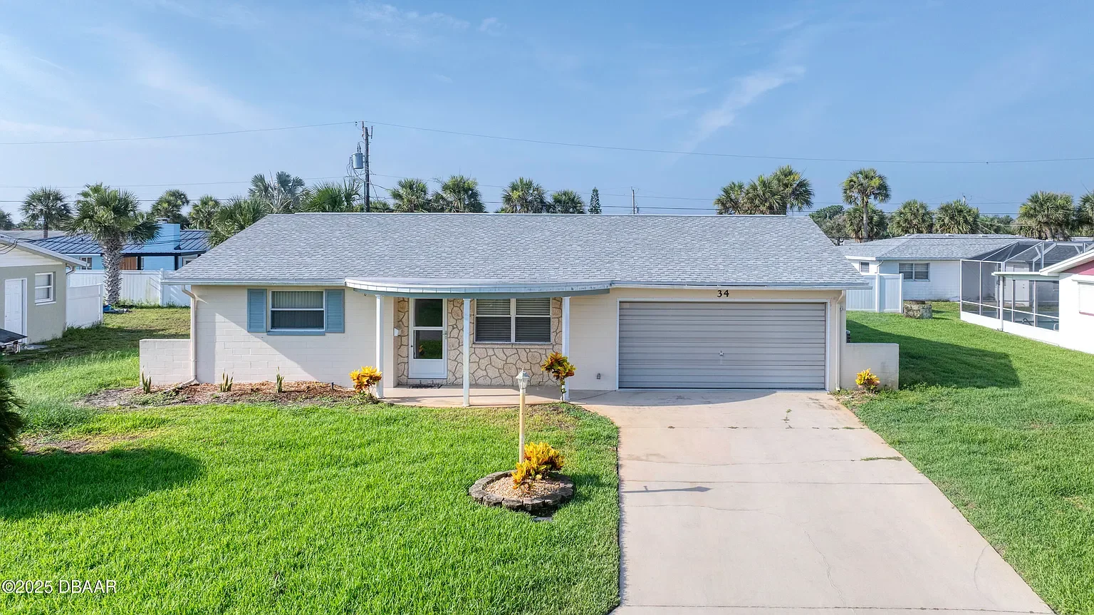 This 3 bedroom 2 full bathroom home in Ormond by the Sea is in need of new owners. Coveted location on Kathy drive where the Intracoastal waterway and the Atlantic Ocean are both just steps away from your front door. This home has a new architectural shingle roof as of 2023 and brand new carpeting as of August 2025. Stepping through the new storm door and solid wooden entry door with leaded glass, your eye is drawn through the living room, the kitchen and built-in library/office all the way to the rear dining room. The southeast and northeast bedrooms share a full bath featuring a tub/shower combination, vanity, and medicine cabinet. There is plenty of storage in the cedar lined closets as well as a coat closet and linen closet in the hallway. The primary suite is situated in the southwest corner of the home and features a cedar lined walk-in closet with an ensuite bathroom with a private entry door into the garage. The large Florida room is fully enclosed and conditioned & it boasts a brand new exterior door to the backyard. At the heart of the home you will find the kitchen &adjacent built-in desk/glass cabinet display area that could be used as a home office or library. The kitchen features a built in breakfast bar, an electric five burner glass cooktop, dishwasher, electric wall oven, refrigerator and door leading to the oversized two car garage. The garage houses the laundry area with washer, dryer and utility sink. The lot is fully irrigated and has a mature, green lawn. This solid block home is ready for your personal decorative touches.